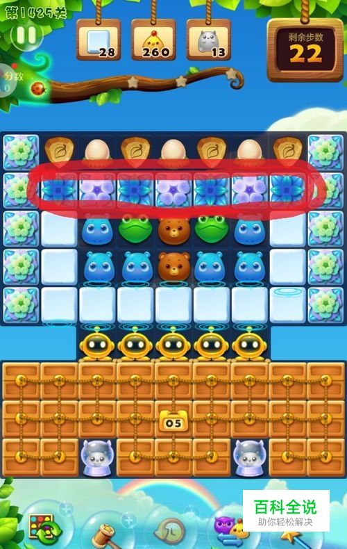 我们第一阶段的目标,是消除最上面的小方块,解放鸡蛋和小树叶,所以,我们要用尽量少的步数来消除这7个小方块,其他的暂时可以不考虑哦。