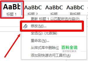 打卡Word2013文档,在你需要修改的标题里头,对着该标题右键,点击“修改”。如图所示。