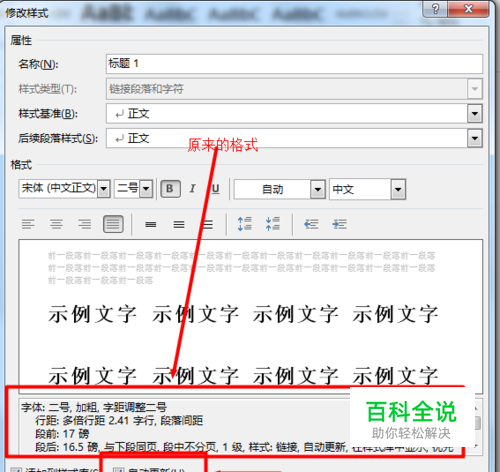 在弹出的菜单里头,你可以看到该标题原来的格式。为了方便你修改后的标题及时更新,点击“自动更新”。下一步就是点击“格式”,进行详细修改格式。如图所示。