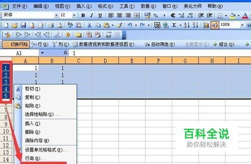 鼠标点按1行标签向下拖动到5行标签,然后点击右键,选择隐藏。