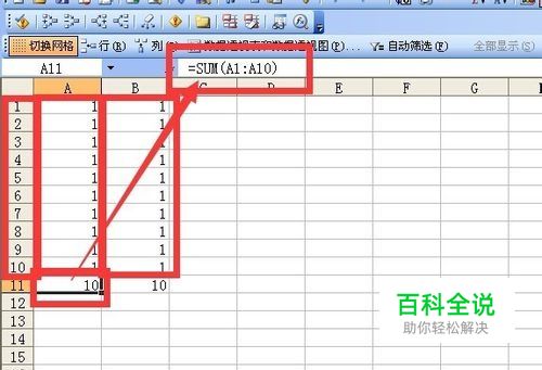 如图所示在a1到啊10和b1到b10单元格中存放的数据都是数值1。在a11中输入函数=sum(a1:a10),求和函数的返回值是10。