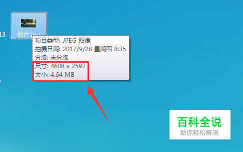 我们首先找到我们需要压缩的图片,将鼠标放到该图片上可以看到相关的信息,此时图片的尺寸大小是非常大的,如图所示: