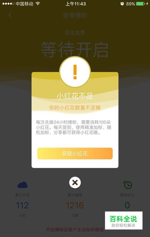 首先进入主界面,点击确认开启坐等爆粉,100朵小红花兑换二十四小时加粉机会。提示不足时,做几个加粉任务就有了。成功开启,坐等被加。
