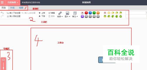 点击新建脑图.km,进入编辑 共有四个大区:1、菜单栏;2、工具栏;3、导航区;4、工作区