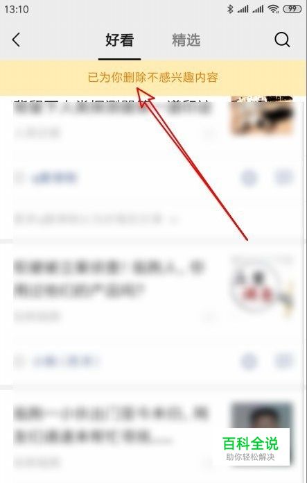 一会就会弹出“已为你删除不感兴趣内容”的提示信息。这样我们就把这些不感兴趣的文章从列表中删除了。