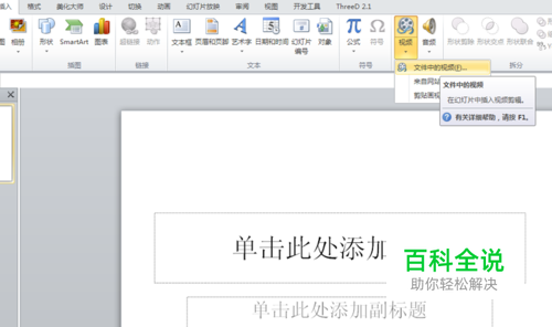 首先启动ppt2010,执行插入-视频-文件中的视频命令。将事先准备好的视频素材导入。