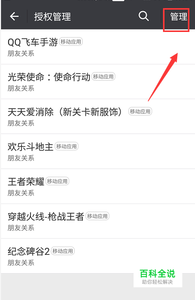 进入授权管理界面,可以看到所有用微信登陆的应用,点击右上角的管理,如下图所示