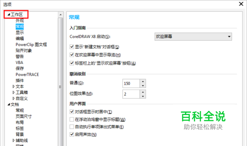 2. 在弹出的“选项”对话框的左侧栏中展开“工作区”类型列表,接着单击子面板中“常规”选项。
