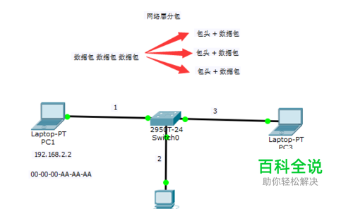 当PC1需要发送数据到PC3,首先网络层会为上层数据分包,然后分别加上IP包头,其中包括PC1的源IP地址192.168.2.2,以及PC3的目标IP地址192.168.2.4。