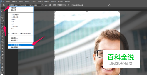 然后我们开始裁剪,将我们的素材裁剪成1寸的尺寸,这里我们按照下图中红色箭头指示位置点击 裁剪工具,然后点击尺寸选择框,这里我们选择点击 大小和分辨率,如下图:
