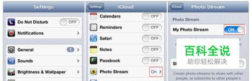 在你的手机上打开照片流: 在手机上依次操作设置 -> iCloud -> 打开我的照片流 (如果它处于关闭状态的话)。PS: 配图为英文状态