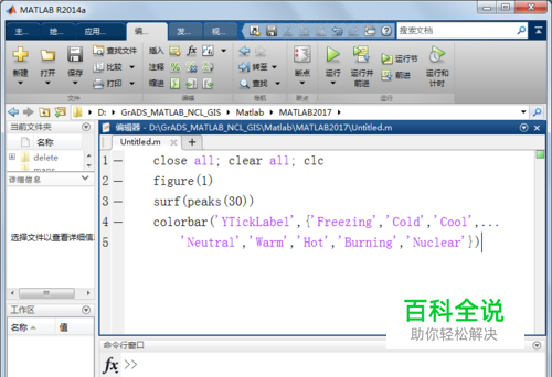 第一,为峰值函数(peaks)的图形添加色标。启动MATLAB,新建脚本,输入如下代码: close all; clear all; clc figure(1) surf(peaks(30)) colorbar('YTickLabel',{'Freezing','Cold','Cool',... 'Neutral','Warm','Hot','Burning','Nuclear'})