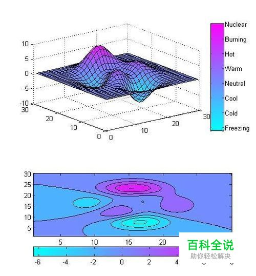 第五,利用subplot对上述脚本进行改进,将figure 1与figure 2画在一张图。脚本改进如下: close all; clear all; clc %figure(1) subplot(2,1,1) surf(peaks(30)) colorbar('YTickLabel',{'Freezing','Cold','Cool',... 'Neutral','Warm','Hot','Burning','Nuclear'}) %figure(2) subplot(2,1,2) contourf(peaks(30)) colormap cool colorbar('location','SouthOutside')