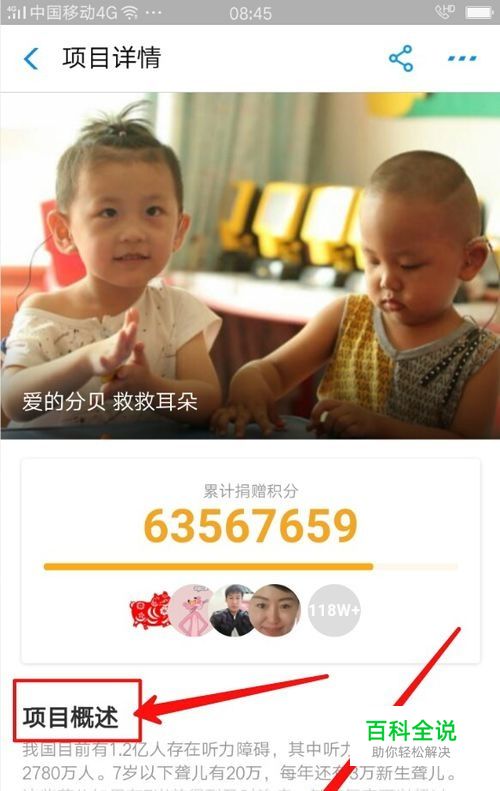 点击【积分捐】,打开【项目详情】页面,可以看到【项目概述】里是为了帮助听力障碍儿童,我们可以点击【立即捐积分】来帮助他们,如图所示。