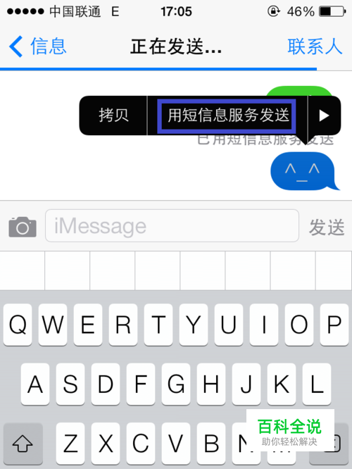 有时候在外面移动网络不好,或是无线网络不好的情况下,就会出现 iMessage 发送不出去的情况。这时我们可以用手指按住正在发送的短信,然后在工具菜单中选择 “用短信息服务发送”选项。这样的话,这条原来是通过 iMessage 发送的短信就改用正常的短信来发送了,而不是 iMessage 。