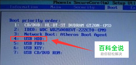 接着在弹出的Boot priority order设置窗口,移动上下方向键将“USB HDD”移动到第一项,然后按F10保存并重启电脑。