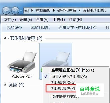 1、依次点击“开始”——“设备和打印机”,找到对应的打印机,然后在上面按右键选打印机属性。