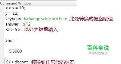 2)keyboard()函数 此函数在运行程序时向用户提供控制,以便用户可以输入数据或附加的MATLAB命令,如果需要的话。这个过程可以被用户有效地使用来调度、检查程序。 此命令运行时,MATLAB提示从“>>”变为“K>”。通过执行命令dCONTT终止键盘模式。dBug也可以用于退出键盘模式,但是在这种情况下调用Matlab代码文件会被终止。