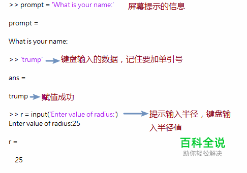 赋值及键盘输入 (1)赋值:可以在代码中,对变量用等号直接进行赋值,如x=5,y=10; (2)键盘输入:键盘为特定字符生成ASCII或Unicode字符串,然后被馈送到Matlab中,对其进行解释,执行特定的任务。 1) input()函数:键盘输入的值,注意要加单引号。
