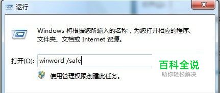 在打开文本框中键入“winword/safe”命令,单击“确定”按钮