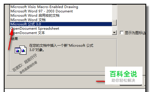 弹出对话框; 在框内找到:Microsoft 公式 3.0 点选;然后再点确定。