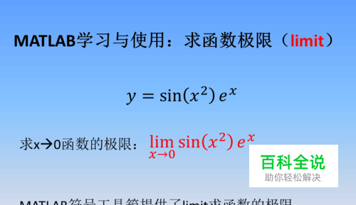 以函数f(x)为例,当x趋近于0时,求f(x)的极限。MATLAB符号工具箱提供了limit求函数的极限。调用格式为limit(f,x,x0),其中f是函数表达式,x是自变量,x0是极限点。