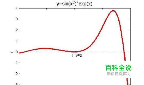 第二,启动MATLAB,新建脚本(Ctrl+N),在脚本编辑区输入如下代码: close all; clear all; clc syms x y=sin(x^2)*exp(x); limy=limit(y,x,0) plot([-2:0.01:2],subs(y,x,[-2:0.01:2]),'r','LineWidth',3);hold on plot(xlim,double(limy)*[1,1],'k--') axis([-2,2,-4,4]); set(gca,'xtick',[-2:1:2],'ytick',[-4:1:4]) text(0,double(subs(y,x,0)),'o') text(0-0.1,double(subs(y,x,0))-0.3,'(0,y(0))') xlabel('x'),ylabel('y'),title('\fontsize{15}y=sin(x^2)*exp(x)')