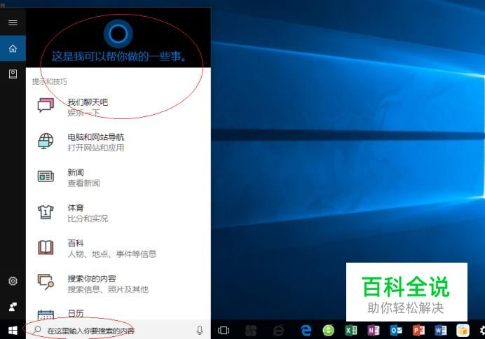 启动Windows 10操作系统,如图所示。点击任务栏搜索框,开始使用Cortana(小娜)智能语音助理。