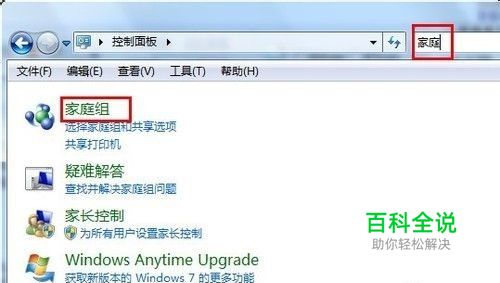 在连接了打印机的Win7电脑单击“开始”按钮,打开“控制面板”。在搜索框中输入“家庭”就可以找到“家庭组”选项。