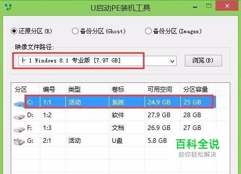 分区好之后打开u启动pe装机工具,选择win8.1镜像文件安装在c盘中,点击确定,如图: