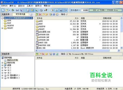 3在UltraISO软件界面上方菜单栏依次选择:文件——打开,找到准备好的ISO文件——GhostXPSP3电脑城快速装机版v2010.01.iso(图2)
