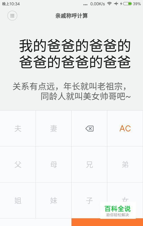 当走亲访友、家庭聚会,不知道亲戚该怎么称呼的时候,只要进入计算器中,点击左上方的小图标,选择亲戚称呼计算,输入相应的关系,计算器就会根据关系系统会帮你“计算”出准确的称呼,特别实用。
