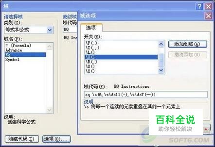 如何插入和编辑EQ域代码呢?很简单,在Word的“插入”菜单中,选择 “域”,在对话框的“类别”中选择“等式和公式”,在下方的“域名”中点击“EQ”并点击左下方的“域代码”,再点击“选项”,分别双击需要的开关名称,即可将它们添加到“域代码”栏,在此栏直接输入或修改域代码,然后依次按“确定”,即可在页面光标位置插入一段EQ域代码(见图2)。直接在Word页面输入以上代码是无效的,必须先用以上方法插入后,再在页面进行修改才有效。右击域代码,在弹出的下拉菜单中点击“切换域代码”可将其切换为直观形式;再切换一次又会显示为域代码。
