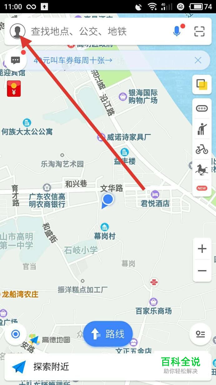 打开手机上的高德地图,进入首页后,点击左上角的“个人头像”,如下图所示: