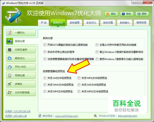 一、选择性关闭视频文件预览的步骤如下: 打开Win7优化大师(1.35版本之后的都支持本独家功能),点击上面的系统优化,再点击左侧的系统加速,目前Win7优化大师提供了6种格式( .avi .mpg .mpeg .3gp .mp4 .wmv)的视频预览开关,轻点鼠标,一切,如您所愿。 注意,本功能需要重启资源管理器的喔,当然,您注销重新登录或者重启计算机也都可以。 重启Win7资源管理器或者重启计算机后,以后再打开电影文件夹的时候,看看,CPU是不是不会动不动就70%以上了,硬盘是不是也不响了?电影文件夹一点就开,要的就是这个效果 :)