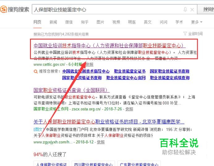 在搜索框中搜索“人保部职业技能鉴定中心”,点击官网链接,如图所示。