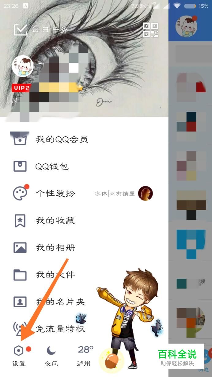 打开手机QQ并登录,点击左上角的头像,然后点击设置,如图所示。
