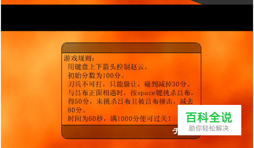 ↑键表示向上运动,↓键表示向下运动,初始分为100分,兵刀不能打,只能躲让。与吕布向遇时,按空格键挑杀吕布可得到50分,未挑杀吕布并且被他撞击者,减去80分,时间为60秒,满1000分便可过关。