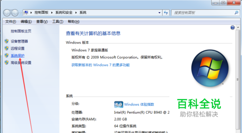 第二步,在弹出来的控制面板对话框中,左边一栏找到 系统保护。具体位置图中箭头所指的地方。