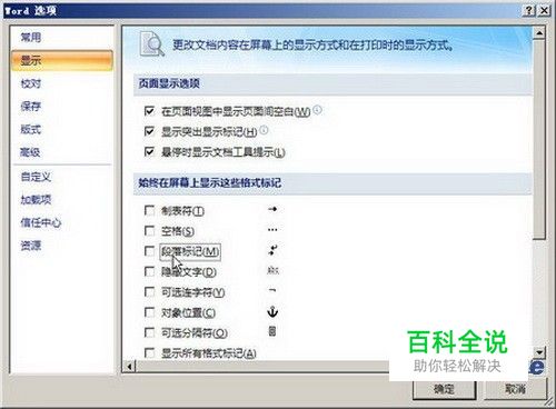 在打开的“Word选项”对话框中切换到“显示”选项卡,在“始终在屏幕上显示这些格式标记”区域取消“段落标记”复选框,并单击“确定”按钮