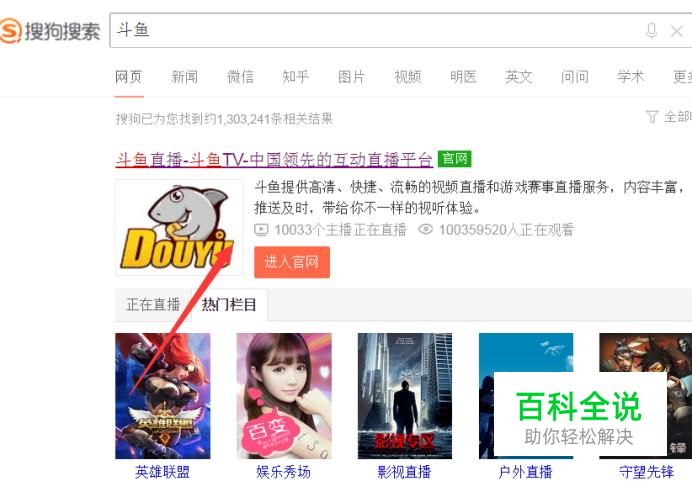 首先用搜狗搜索找到斗鱼的官方网站,然后点击进入,如下图