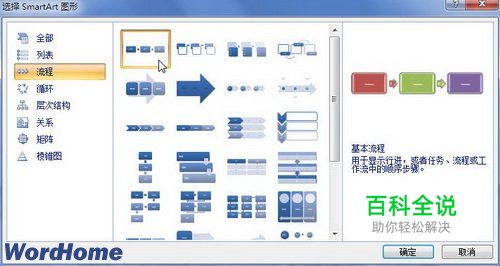 2.流程型:表示任务流程的顺序或步骤,如图2011081002所示。 图2011081002 流程型SmartArt