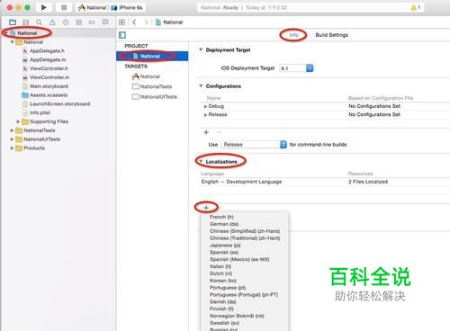 二 . 内容国际化 新建一个Localizable.strings 文件 (Localizable.strings 是系统默认名字),添加语言同上面设置应用名称时一样