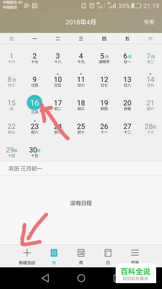 点击到确定的“月”后,然后点击其中的你要设置的日期,假如为是“16”号,然后点击左下方的“新建活动”。