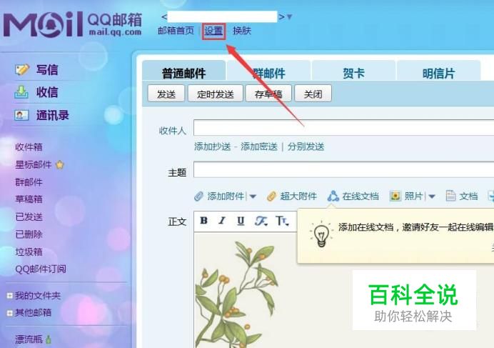 首先,打开QQ邮箱软件主页面,点击页面顶部“设置”按钮,进入QQ邮箱设置页面。