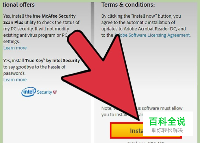 拒绝安装迈克菲(McAfee)软件。当你在安装Adobe Reader时,会弹出一个对话框,它会进行自动检测并在计算机上安装迈克菲软件。大部分用户都不希望协同安装迈克菲,所以确保取消安装迈克菲对话框的选择。