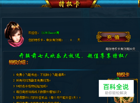 在九鼎记里面,大家发现很多地方如果大家拥有特权卡都可以免费操作一些事情,比如副本大家没法扫荡,需要扫荡卡,击杀怪物没经验,需要特权,今天小编就给大家介绍下特权卡的特权以及获得方法。 首先九鼎记特权卡打折价格购买的话只要49元宝就可以了,拥有特权卡后,玩家可以免费试用小飞鞋传送,免费扫荡副本,享受5%的击杀怪物经验加成,而且每日竞技场挑战次数增加2次,补签机会+1次,每日一次免费的战神之争补报名的机会,每天可以免费领取50%的活动经验找回,可以免费领取5倍离线经验找回,增加幸运占盘免费次数1次。每张卡购买后有效期是30天。 好了,九鼎记特权卡特权就是这些了,大家快去购买吧。