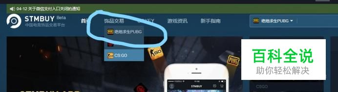 在官网上点击饰品交易, 找到绝地求生PUBG并点击,如图所示。