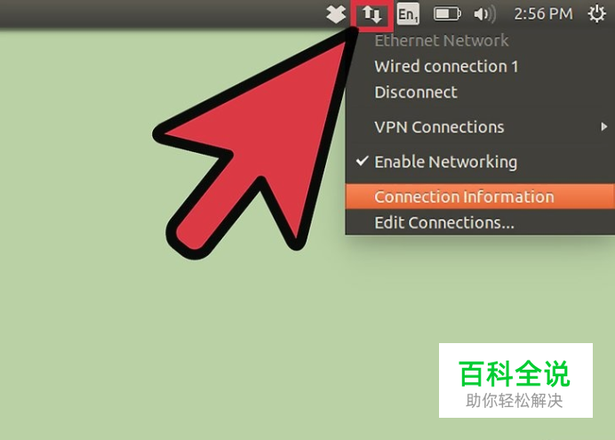 右键点击通知区域里的网络图标。在大多数乌班图系统里,这个图标看上去是由两个垂直的箭头组成的,一个朝上一个朝下。网络按钮多位于日期和时间的旁边。 如果没有显示网络图标,你可以右键点击通知栏,选择“添加到面板”,然后选择“网络管理器”来添加图标。 如果还是不能显示网络图标,请前往“系统” > “管理”>“网络工具”,然后从下拉菜单中选择你的网络设备(通常是“eth0”端口)。接着,显示的10位数字就是你要查看的IP地址。
