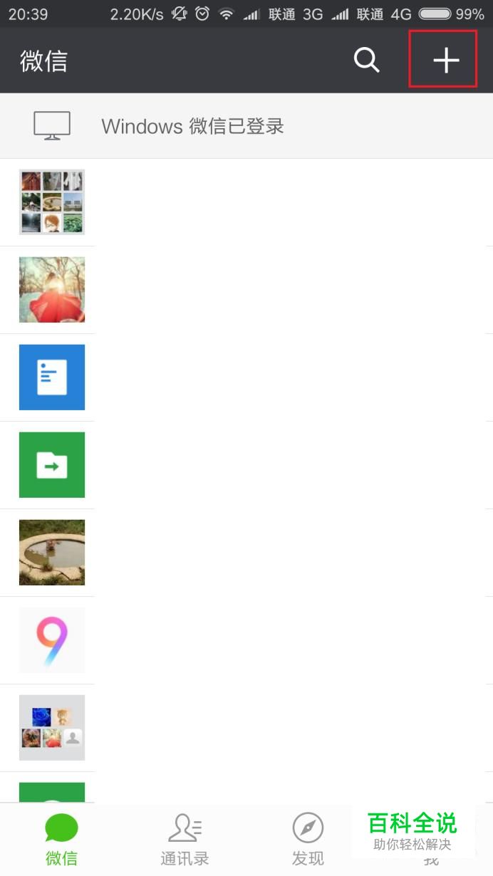 打开手机微信应用主页面,点击页面右上角“+”按钮。